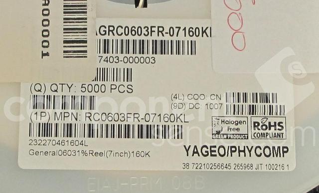 Res Thick Film 0603 160K Ohm 1% 0.1W(1/10W) 100ppm/C Pad SMD T/R