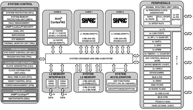 Dual-core SHARC+ and ARM Cortex-A5 SOC, dual DDR, 2xEthernet, 2xUSB, SDIO, PCIe, 529-cspBGA