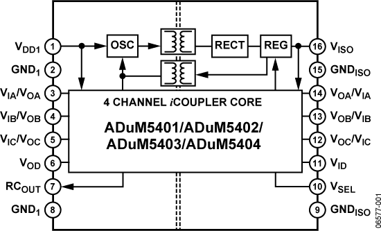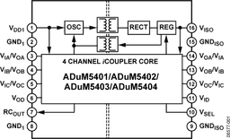 Quad-Channel, 2.5 kV Isolators with Integrated DC-to-DC Converter (1/3 channel directionality)