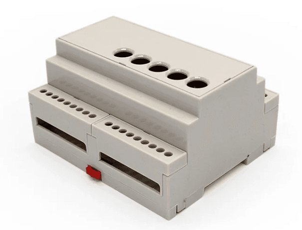 Medium-duty automation enclosure (106x90x58mm). A robust housing solution for process control modules. It includes integrated terminal guards to prevent accidental contact and ensure electrical safety compliance.