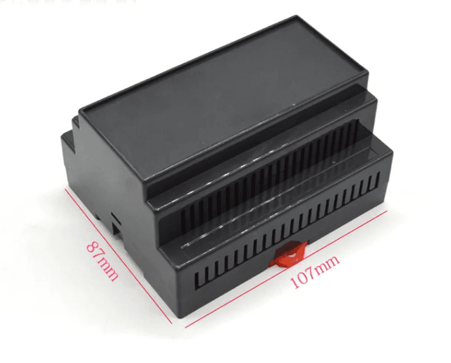 Solid-top industrial enclosure (107x87x59mm) designed for custom machining. The blind-cover configuration allows engineers to cut specific openings for LCD displays, membrane keypads, or proprietary interfaces. Robust construction ensures stability on standard DIN rails.