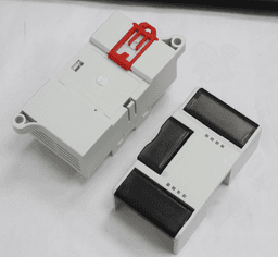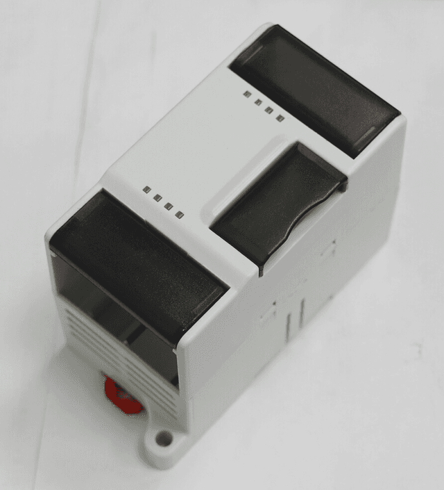 Rectangular instrument housing (110x65x50mm) optimized for measurement devices. The enclosure features a clear demarcation between the control area and the terminal block section. Manufactured from UV-stable ABS for long-term durability.