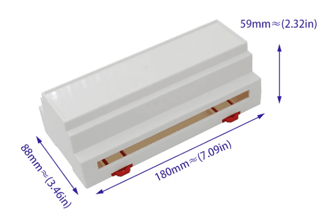 Long-format rail box (180x88x59mm). Designed for specialized controllers requiring a long, narrow footprint. Ideal for bus communication modules.