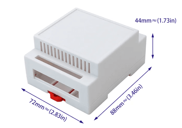 Low-profile 4-module housing (88x72x44mm). A reduced-height version of the standard PLC case. Ideal for shallow cabinets where depth is a constraint.