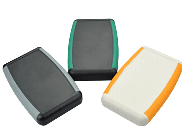 Portable electronics housing (117x79x24mm) featuring an integrated battery compartment specifically designed for standard 9V (PP3) blocks. The enclosure offers an ergonomic grip with textured side panels and a screw-secured battery door, making it ideal for mobile multi-meters and wireless transmitters.