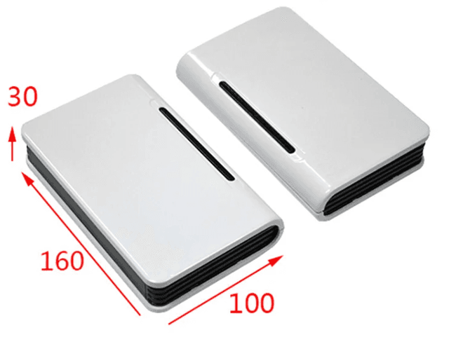 Extended rectangular gateway housing (160x100x30mm). This enclosure provides additional length for larger communication boards or dual-antenna configurations. Manufactured from impact-resistant thermoplastic, it includes dedicated areas for LED status indicators and rear connector ports.