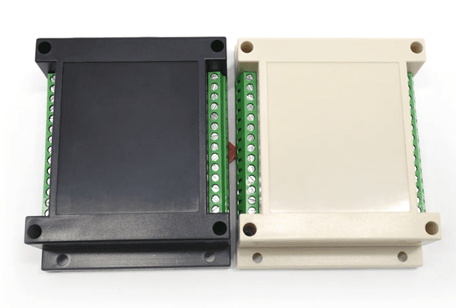 Vented low-profile PLC housing (115x90x40mm). Identical in footprint to the standard 115mm series but features engineered side ventilation slots. Designed for heat-dissipating electronics like power relays within a compact vertical clearance.