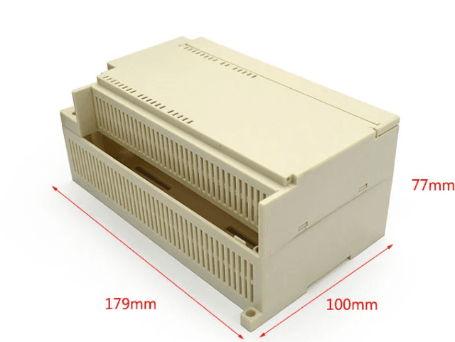 Extra-long interface housing (179x100x77mm). A deep and long enclosure providing massive internal volume. The 77mm height allows for tall relays and transformers.