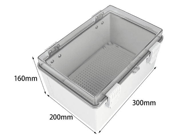 Measuring 300x200x160mm, this waterproof enclosure combines a rugged ABS base with a transparent polycarbonate (PC) cover for real-time visual inspection of internal components. The IP67-certified vacuum-tight seal ensures total protection against particulate ingress and high-pressure water jets in harsh industrial environments.