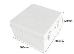 This square-format 300x300x170mm enclosure is injection-molded from UV-stabilized ABS, providing a wide footprint for complex automation controllers. It includes an opaque hinged lid and internal mounting bosses, ensuring professional-grade shielding for outdoor electrical junctions.
