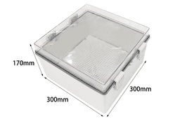 Featuring 300x300x170mm dimensions, this model incorporates a clear polycarbonate hinged lid to facilitate rapid diagnostics without breaking the IP67 seal. The robust plastic latches and high mechanical rigidity are tailored for smart grid and renewable energy monitoring systems.