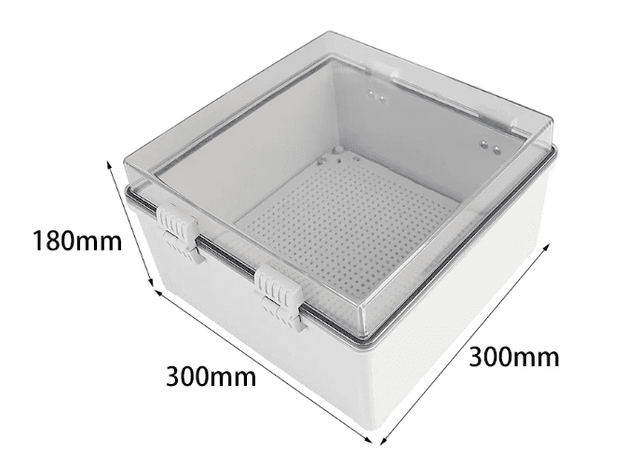 Measuring 300x300x180mm, this model features a transparent PC hinged cover and a rugged ABS base for high-visibility industrial monitoring. The expansive internal volume and integrated mounting plate support the installation of sophisticated networking and power distribution hardware.