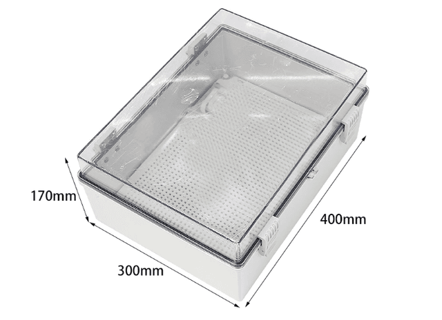 Measuring 400x300x170mm, this model incorporates a clear hinged lid for instant visual tracking of internal meters and status displays. Its high-impact ABS body and vacuum-tight sealing gasket provide a reliable barrier against extreme weather and industrial contaminants.