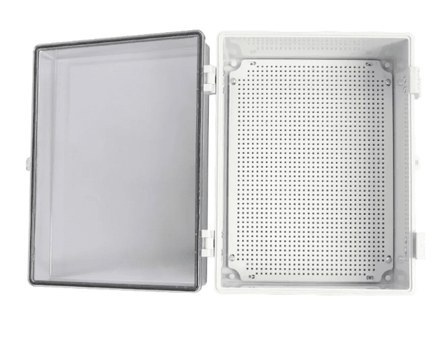 Featuring 400x300x180mm dimensions, this enclosure utilizes a transparent PC hinged lid for non-intrusive monitoring of internal instrumentation. The IP67-rated waterproof housing and robust plastic latches ensure the safety of sensitive electronics in coastal or chemical processing zones.