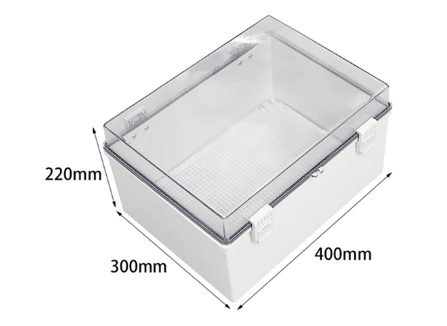 Measuring 400x300x220mm, this IP67-rated enclosure features a clear polycarbonate (PC) hinged lid for real-time visual tracking of deep-profile internal components. The robust plastic buckle system and vacuum-tight gasket ensure long-term durability against environmental dust and high-pressure water jets.