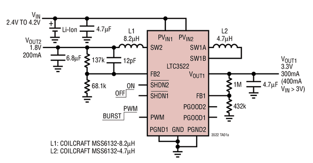 400mA, 1MHz Synch Buck Boost & 200mA Synch Buck Converter in 3x3 QFN