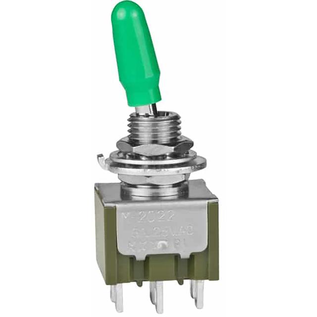 Switch, Mini Toggle, DPDT, On-none-on, .413 Bat Actuator, Grn Cap, 6A, 125VAC, Solder