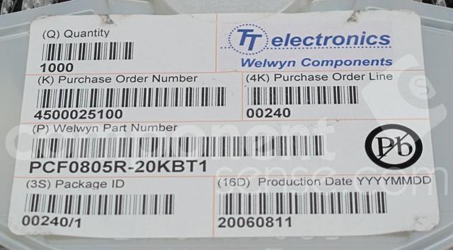 Fixed Resistor, Thin Film, 0.1W, 20000ohm, 100V, 0.1% +/-Tol, 25ppm/Cel, Surface Mount, 0805