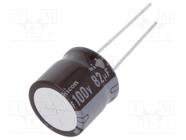 Aluminum Electrolytic Capacitor, Polarized, Aluminum (wet), 100V, 20% +Tol, 20% -Tol, 82uF, Through Hole Mount